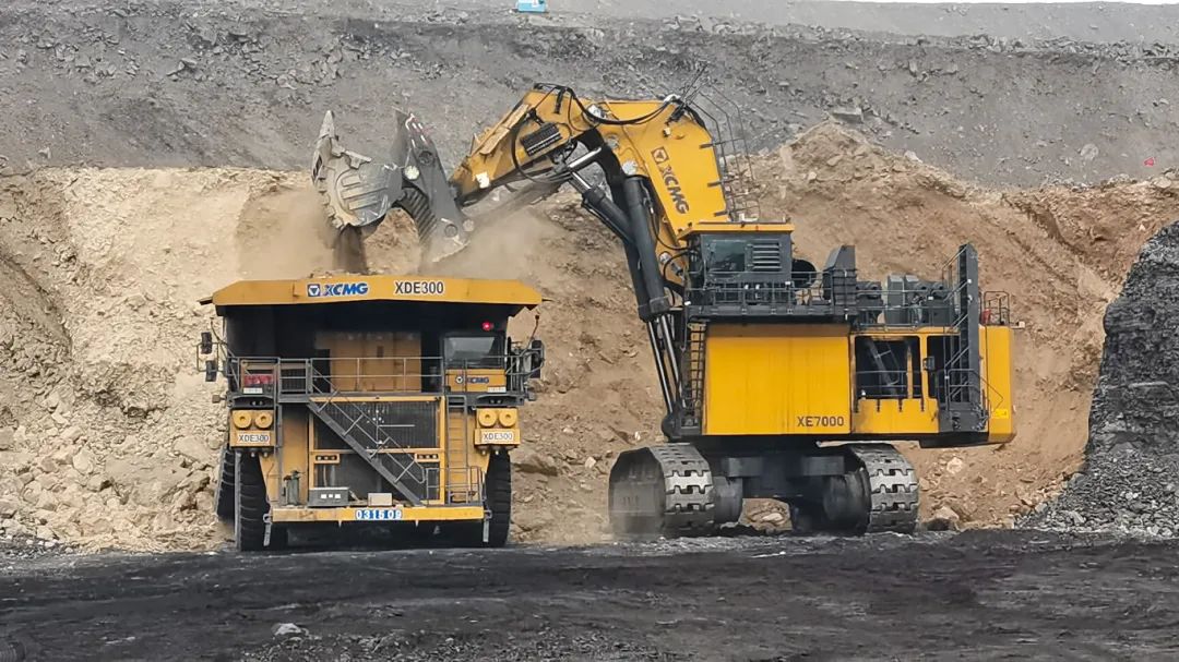 在内蒙,徐工XE7000矿用挖掘机与XDE300双桥刚性矿车铿锵作业;