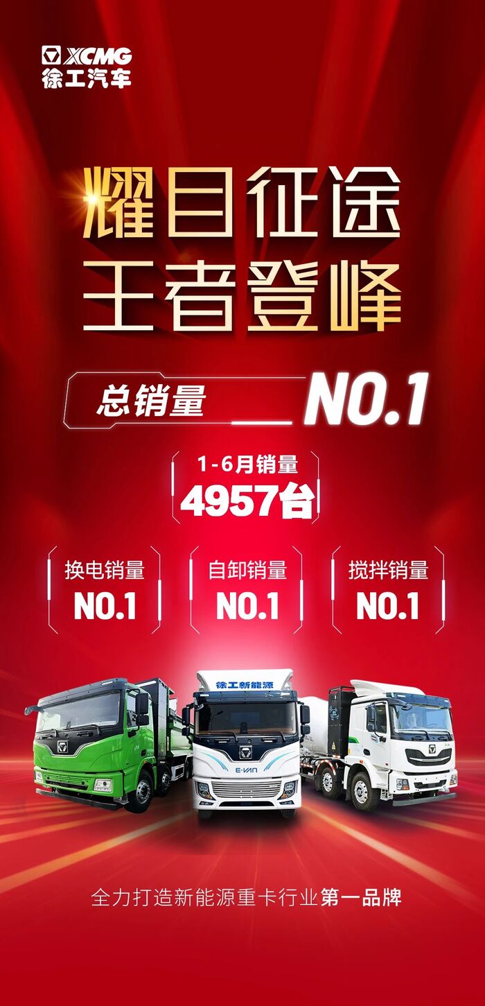 据第一商用车网发布的榜单显示,2024年1-6月,徐工新能源重卡累计销量4957继2023年度累销冠军、2024一季度累销冠军的良好势头,再次荣登2024年半年度新能源重卡销量榜首。