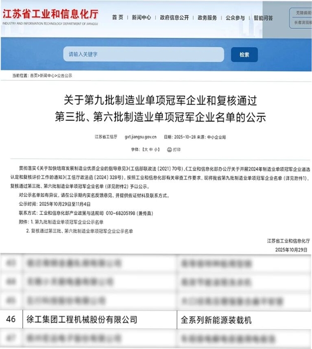 经徐州市推荐、江苏省工信厅评选、协会专家评审、工信部审核等流程,徐工全系列新能源装载机入围“第九批制造业单项冠军企业”名单。