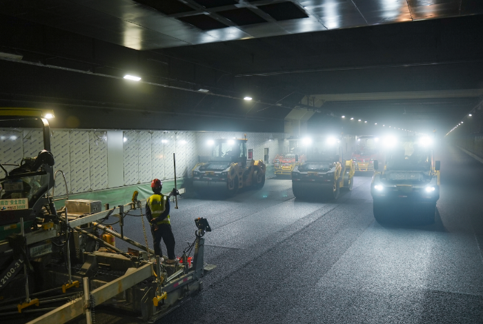 业内率先采用“能级”概念,优化振荡参数,徐工XD135TOSIV振荡压路机可将铺筑材料生产后1小时内压实,效率更高;同时,采用振荡压实技术,仅产生水平(切向)方向的振动,对机器两侧的振动仅为传统振动压路机的15%,大幅减轻对沉管隧道的影响。
