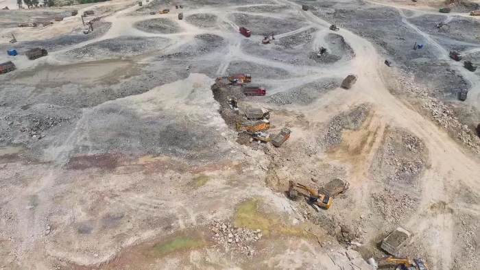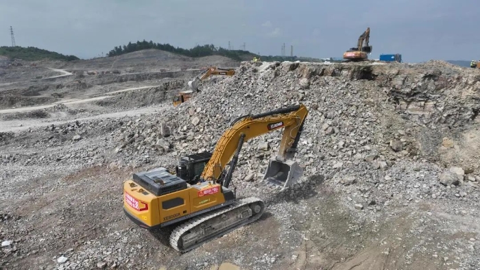 前期爆破剥离工序后,徐工20吨挖掘机搭配140的小破碎锤进行二破,同时XE380GK、XE600GK等机型进行挖装作业。现场共投入挖掘机50多台,每天的挖方量在10万方左右。