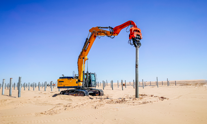 此次徐工挖掘机参建的巴彦淖尔100万千瓦光储+生态治理项目位于内蒙古西部,是自治区年度重点工程,对当地资源开发和绿色发展具有重要意义。 与以往常规项目不同,此次徐工挖掘机主要担任光伏桩的铺设工作,通过改装振动锤和引孔机等多功能属具,有效满足现场多元化施工需求。