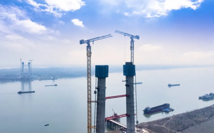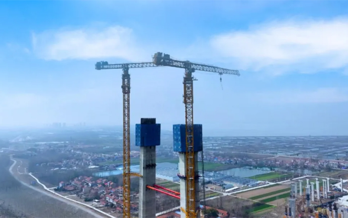 大桥主墩建设是整座大桥顺利完工的“压舱石”,大桥北主塔高度211.75米,采用主塔钢筋部品整体吊装。作为徐工超大塔中的明星产品,两台徐工XGT2230A-100S扛起大桥北主塔的施工重任。