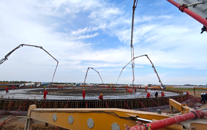 据了解,该项目库容量200万立方米,新建20座10万立方米外浮顶储罐,占地约650亩。项目建设面临泵送方量大、持续时间长、浇筑无间断等特殊施工要求,徐工大米数泵车凭借稳定高效、节能可靠、智能安全,成为项目泵送主力军。