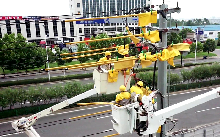 在电力杆线迁改施工现场,4名带电作业人员严格做好安全措施后,穿上黄色的绝缘服,乘坐徐工GKJH21绝缘斗臂车升入高空,将跨滁河大桥上的原10千伏泗水04线上电缆与架空线连接引线断开,为当日连接新建线路做准备。整个施工过程高效、安全、平稳,获得现场施工负责人的认可。