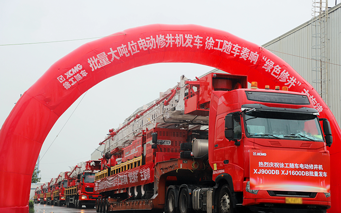 本次批量发车的两款产品型号分别是XJ900DB和XJ1600DB。其中,徐工XJ1600DB电动修井机是行业首台160t级电动储能自绷绳修井机,整车宽度2.55m,满足最新国标道路法规要求,为同等级行业首款可上正式牌照的产品,解决了每次转场前都要办理临时牌照的难题。