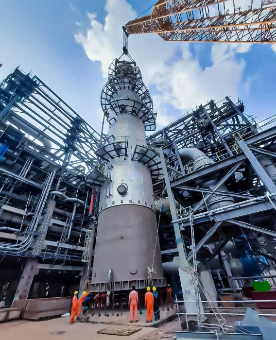 吊装过程中,徐工XLC30000履带起重机采用108m超起主臂单双臂增强工况,将重达650t的项目首台氢化反应器缓缓起吊竖立,并提升至40m高处,随后完成吊载回转,精准落置在指定安装位置。