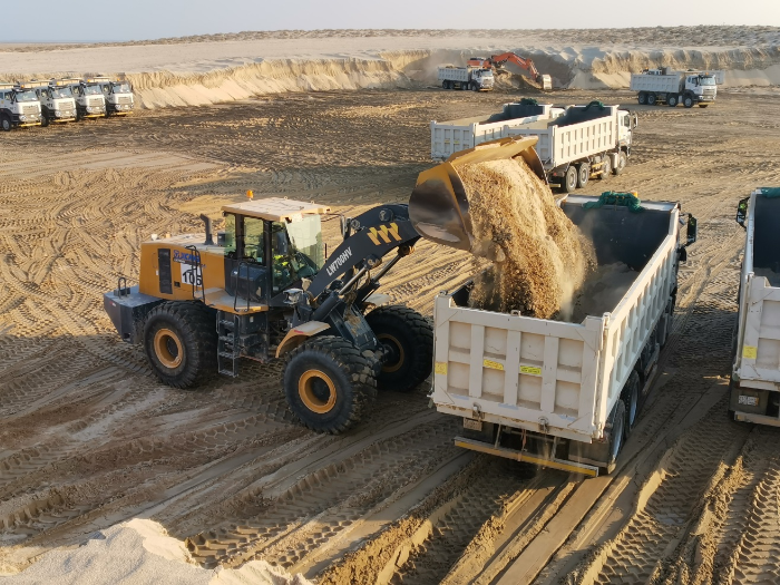 亚洲某国,新建大型公园建设现场,徐工LW700HV与ZL50GN相互配合高效进行着土方作业。2020年,客户开始采购徐工设备,对ZL50的作业性能与可靠性非常满意,随着业务量的不断增加,客户开始考虑大吨位产品。经过当地徐工销售的全力推荐,客户加购了徐工LW700HV装载机,该产品也已优异表现赢得客户的赞赏。配合自卸车,对密度约1.8t/m³的沙土进行转运作业,徐工LW700HV搭配4.5m³铲斗作业起来效率惊人。