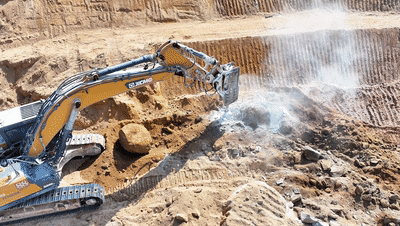 这边岩石硬的很,后期破碎特别吃力,在徐工工作人员的推荐下,我们尝试了徐工大吨位挖掘机,果真像鸡蛋碰石头,一碰就碎,于是后面我们陆陆续续都置换成了徐工。