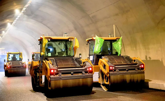 隧道内数智化云端平台显示,“打头阵”的摊铺机将沥青混合料均匀铺展,5台压路机默契配合压实,展现出徐工智慧施工技术成套道路装备强大的协同作业能力。