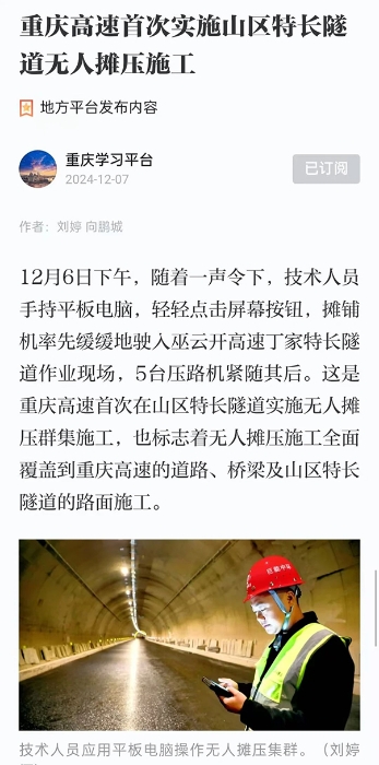 近日,徐工智慧施工技术成套道路装备在重庆交通建设领域再次展现卓越实力,在巫云开高速公路项目丁家特长隧道施工中,成功突破山区特长隧道无卫星信号等技术难题,顺利实施了无人摊压群集施工,开创了重庆隧道内智慧施工的先河。