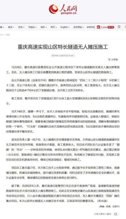 项目负责人介绍,“无人摊铺对定位精度要求非常高,尤其是山区长隧道中存在卫星信号弱等技术难题,施工难度极大。”