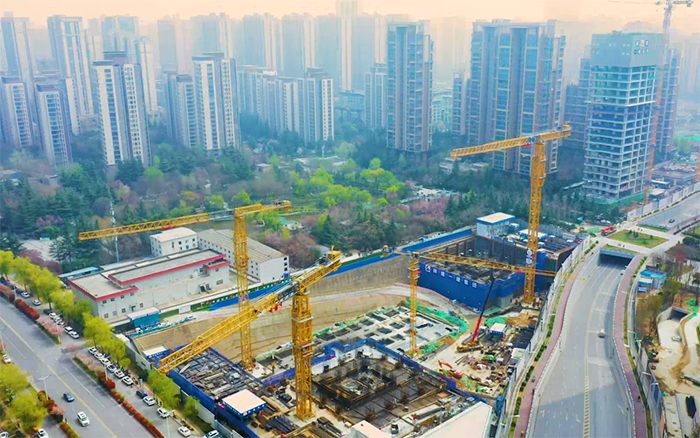 两台徐工超大吨位塔机XGT1350-64S是该项目的吊装主力军,主要负责钢结构及主体施工材料的吊装工作,与徐工XGT600-25S、XGT6015-8S1配合作业,为古城西安再添城市CBD。