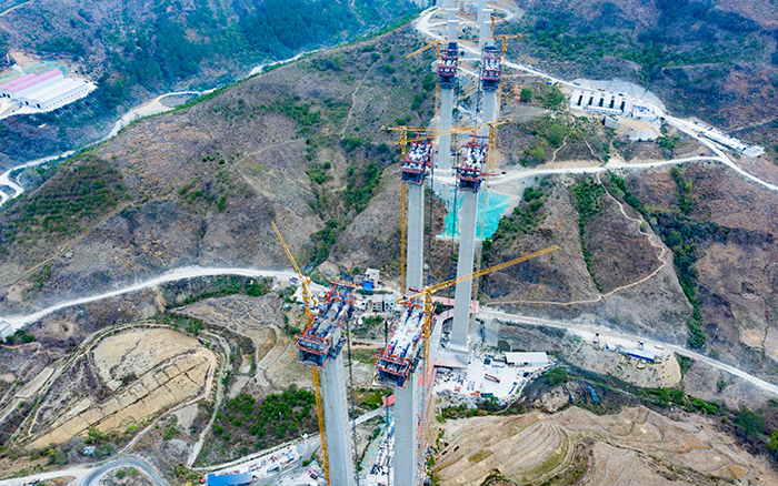 苍翠延绵的群山深处,一根根百米高墩拔地而起,自东向西整齐排列,二十余台徐工S1系列塔机、施工升降机与青山比肩,正有条不紊地吊装,助力雅长特大桥建设加速。