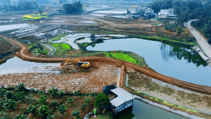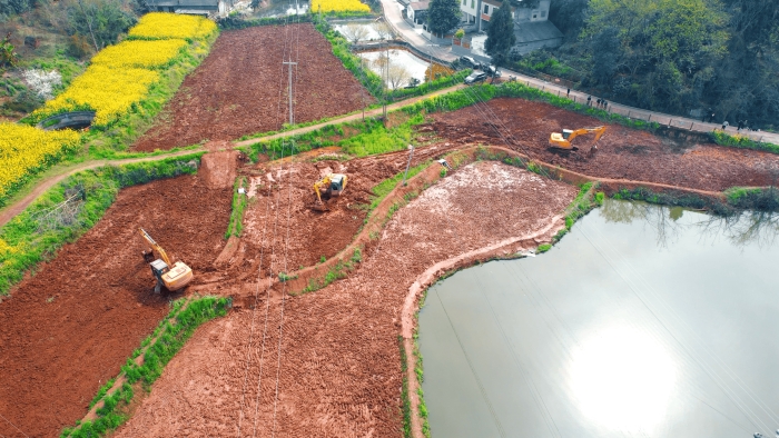 继续向东,这里是万里长江第一城——宜宾,在宜宾江安县阳春镇,5000亩高标准农田建设进入尾声,项目高峰期投入30余台徐工挖掘机