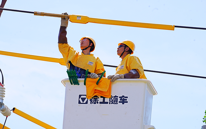 当日,骄阳似火,酷热难耐,地面温度高达 40℃。但供电工作人员们毫不退缩,他们争分夺秒,绝缘手套里的手掌早已被汗水泡得发白,却仍稳稳攥着工具精准操作;斗臂车内的温度计指针不断攀升,他们却顾不上擦去汗珠,全神贯注盯着线路接口。为了缩短停电风险窗口,用高效的操作与高温赛跑,全力保障供电不中断。徐工 GKJH22A 绝缘斗臂车稳稳地停靠在作业点旁,它犹如一位钢铁巨人,随时准备为施工人员提供坚实的保障。