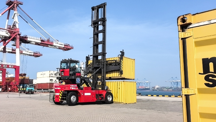 在山东港口繁忙的作业前沿,徐工纯电动堆高举重若轻动作行云流水——快、稳、准,高效流转一次就位