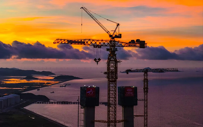 在封顶作业中,徐工塔机将百吨构件以毫米级精度吊装至200余米高空,硬刚10级海风,创造了海上桥梁建设新纪录。多台群塔协同作业,创造性攻克"高空精度、抗风稳性、吊装效率"三大世界级施工难题,展现了中国装备的卓越性能。