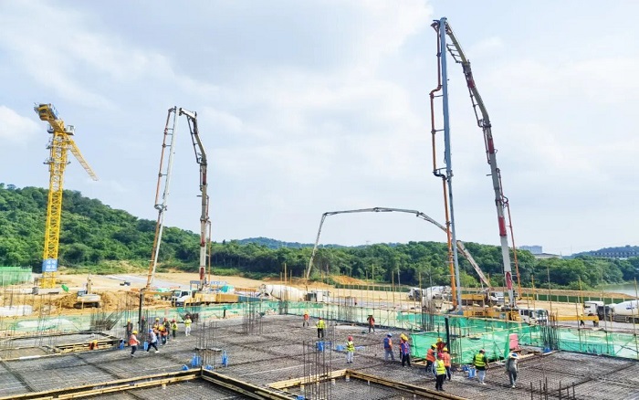 此次浇筑项目为长江军事主题文化区-中山舰博物馆关键部分,徐工以 “1+2+10+1” 成套化设备1台HB72V、2 台HB62V大米数泵车打头阵,10台12方新能源搅拌车、1台XGT7026-12S1塔机组成 “补给梯队”展现“1+2+10+1 > 14”的成套化作业优势。