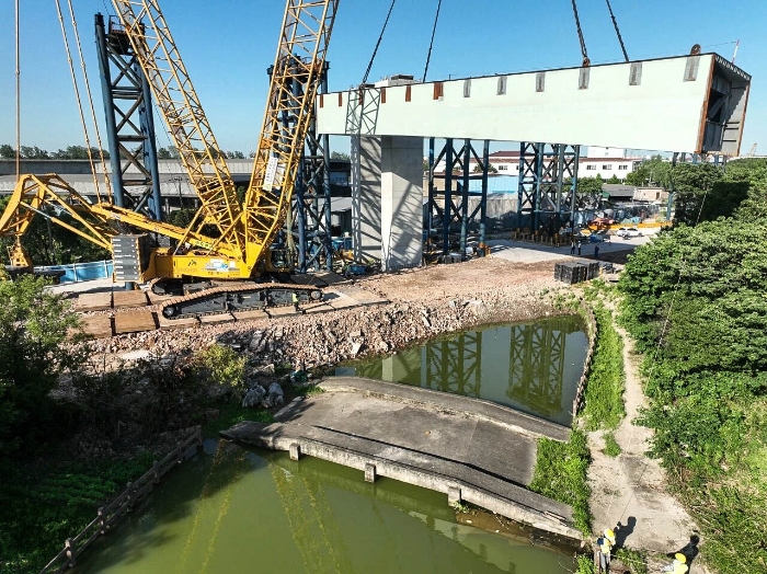 近日,徐工XGC11000(650吨级)履带起重机现身上海沿江通道施工现场,将11段大型预制节段梁平稳安装就位,助力项目关键节点高效推进。