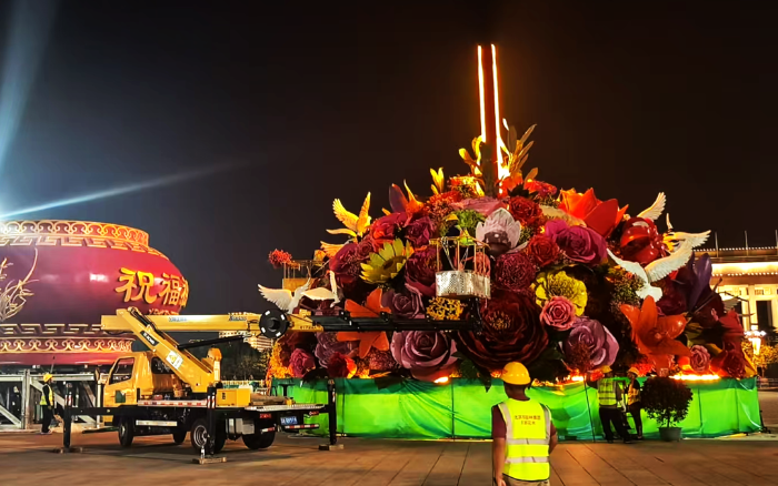 这已是徐工连续第十五年参与天安门国庆花篮吊装任务。9月22日凌晨,两台徐工200吨级汽车起重机协同作业,将重达60吨的篮盘平稳起吊,与16米高的篮体实现毫米级精准对接。