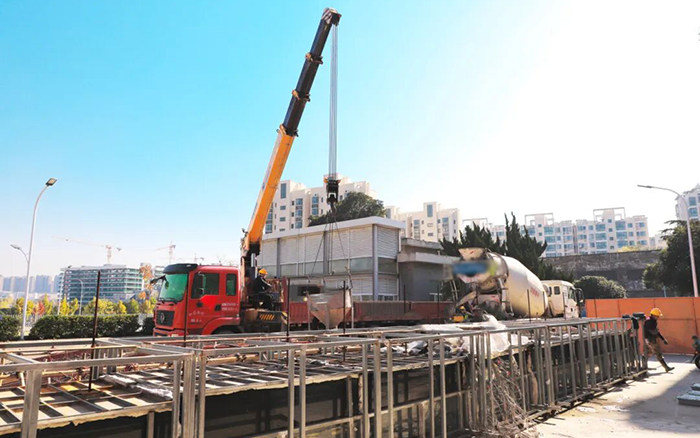徐工随车起重机伸展金色长臂,精准挂钩作业装置,与一旁的混凝土搅拌车紧密配合,将混凝土稳稳输送至钢筋框架结构内。