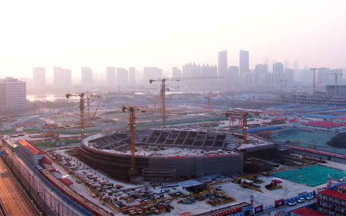 该项目造型独特,主赛场区域结构复杂,同时采用大量的曲线设计,给现场钢筋、水泥预制件的制作与安装带来了巨大挑战,也对塔机的综合性能提出极高要求。