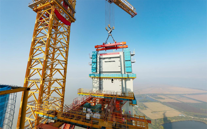 从北航道桥南北锚碇封底,到数十个大型钢塔节段的精准吊装,再到北主塔塔柱主体工程圆满完工,徐工XGT15000-600S始终以“稳扎稳打、精工致微”的卓越表现,持续提升主塔建设效率与作业可靠性,见证着这座世界级大桥主塔节节攀升。