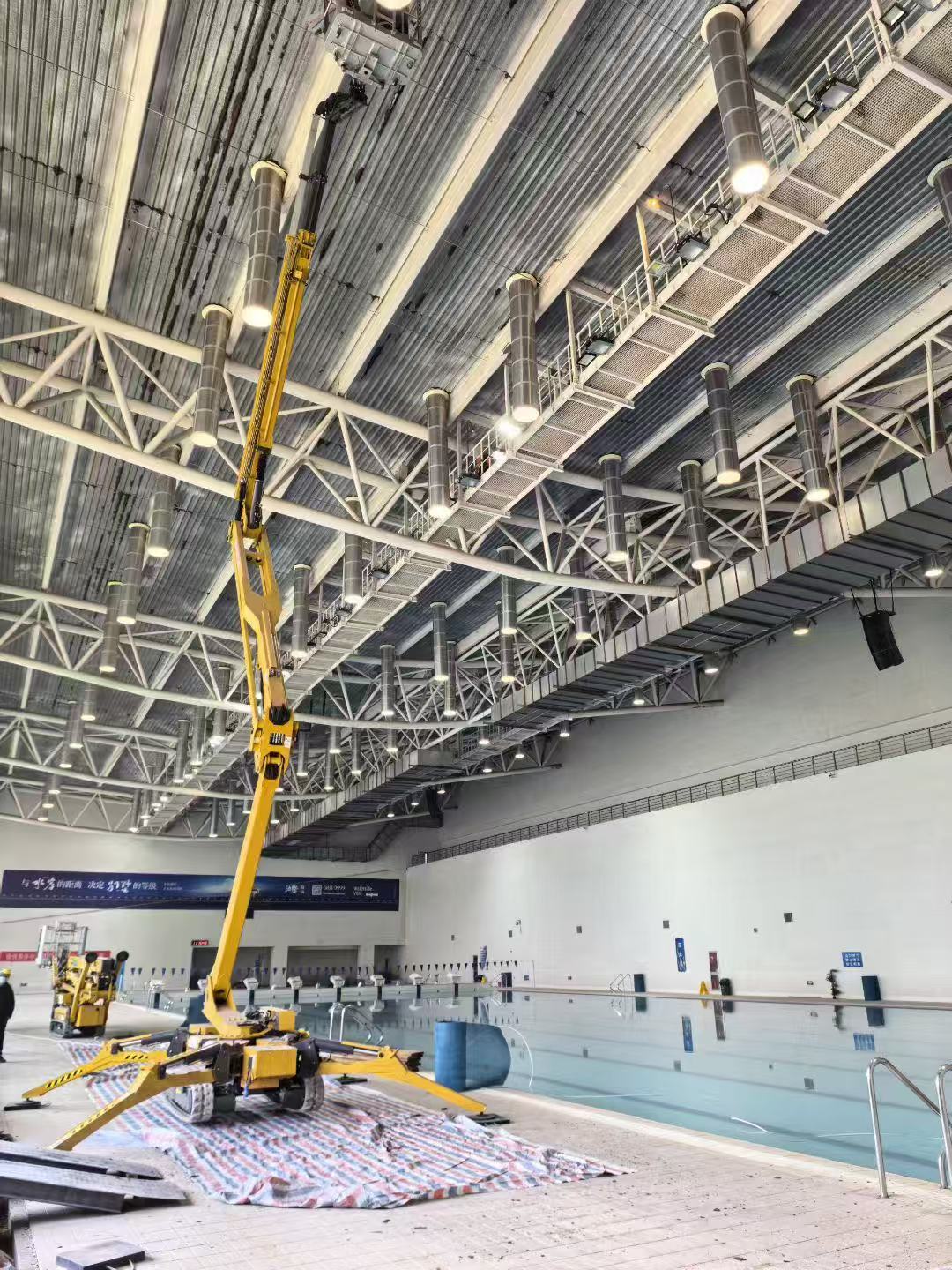 该设备采用履带式底盘,自重4.6吨,接地比压小,完美适配泳池低承重及地面保护作业;车宽仅0.99m,可灵活穿梭狭窄通道,通行无阻;工作幅度可达15m,无需频繁起降,省时高效,到场即可开工,此次施工仅配置3台设备和10名操作人员,便能高效推进任务,在保障工程质量的同时显著缩短了工期,实现了效率与成本的双重优化。