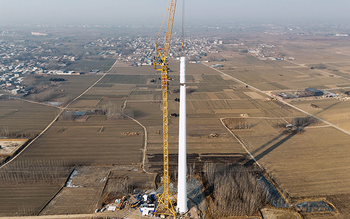 河间7万千瓦保障性并网风电项目,是沧州绿色能源布局的重要一环。项目采用的风机轮毂中心高达165米,叶片长度112米,最大核心部件吊重达193吨,这对吊装设备是实实在在的考验。
