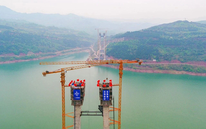 作为国内山区首座PPP模式下实施全生命周期BIM+技术的千米级特大桥,高度为177.5米的钢筋混凝土主塔,相当于60层楼的高度,矗立于长江两侧。晴雨莫测、地势复杂、施工高度高、昼夜施工不间断作业……一系列复杂的施工条件,其施工难度不言而喻,对于塔机的各项性能都是极大的考验。