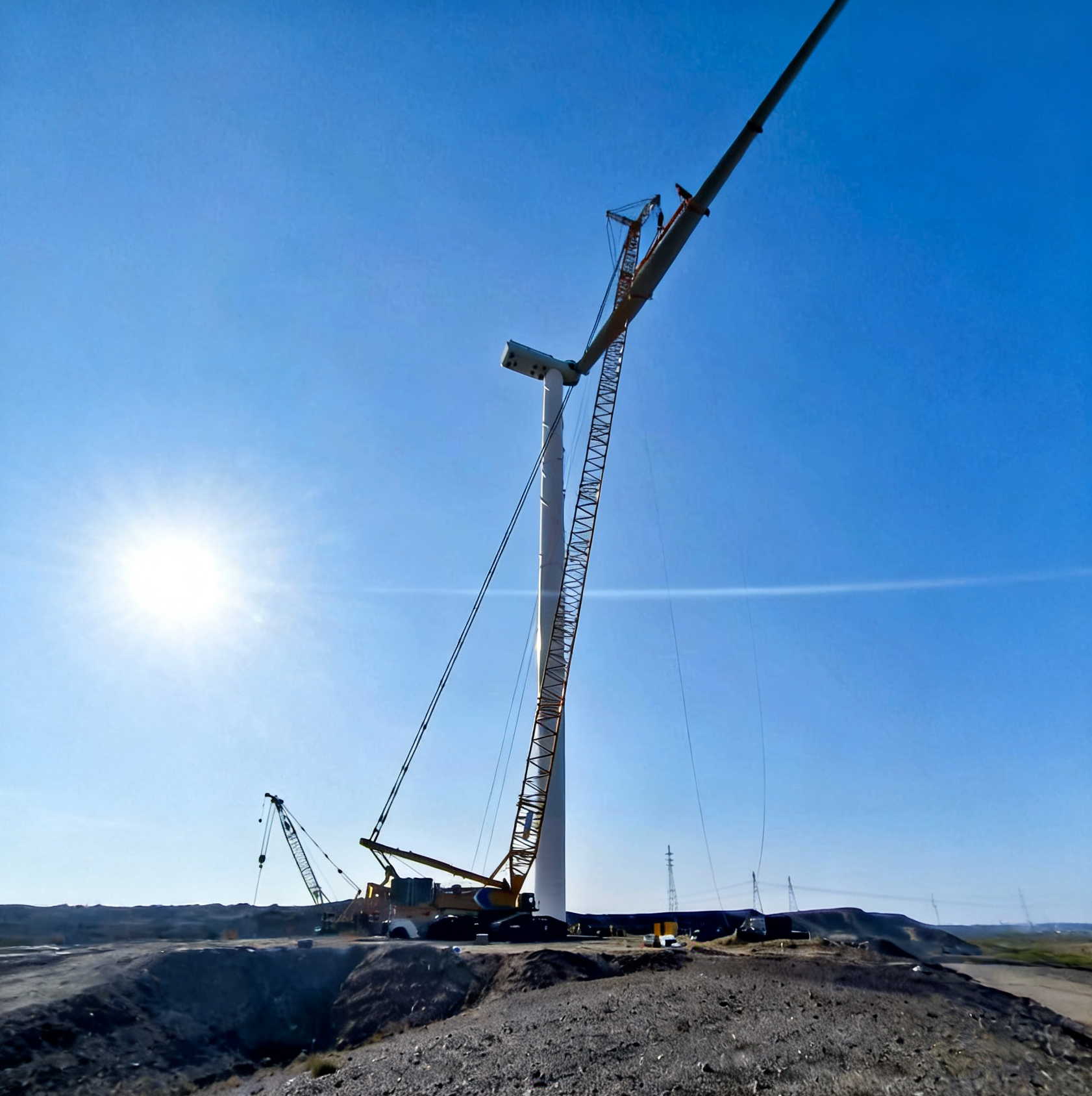 XLC15000采用超起工况,将130吨机舱稳稳送至百米高空,吊钩动态防摆技术悄然发力,重物如被无形的手托稳,毫米级精准对接塔筒法兰,风沙难扰分毫。