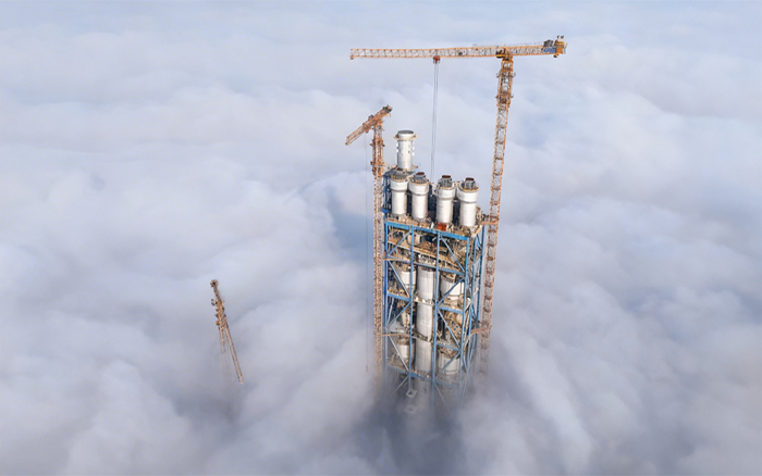 为此,四台徐工塔机分工明确、穿插有序,以卓越的抗风设计与毫秒级微动控制技术,在200米高空实现吊装的精准就位,为同步焊接作业构筑起稳固的安全平台,成功为项目提前60天竣工提供设备基础。